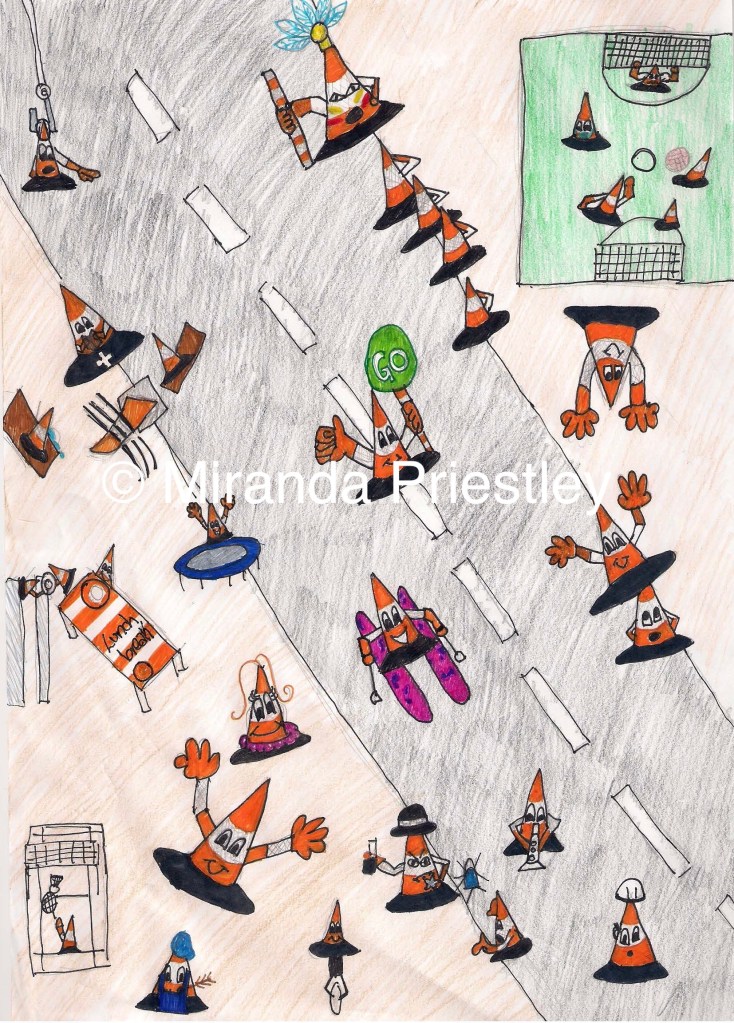As a child, we used to holiday in the UK, meaning I spent many hours during summer holidays in the back of the car, driving up and down the country. As an only child, I was forced to use my imagination for entertainment. I remember staring out of the car window, the hum of the car engine in my ears, watching those bright orange traffic cones stand like little soldiers on the road. Were they on a mission? Were they lost? Each cone frozen in time, with a story waiting to be told. As the UK highway introduced new colours, new arrangements and signage for these cones, it only encouraged me to set my imagination free!